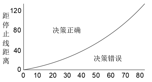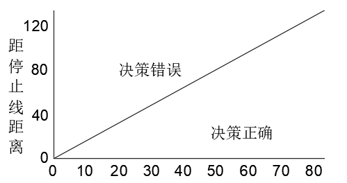 如果驾驶员在看到黄灯时,距离停车线的位置比速度乘以黄灯时间所得距离小,车辆能顺利通过停止线,也就是在绿色曲线下方,说明通过的决策是正确,反之在上方说明通过的决策是错误的。