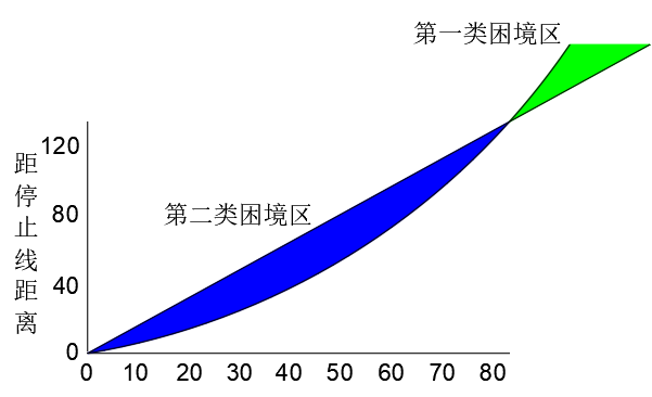 此时产生一个新的问题——困境区域。左图曲线的上方表明制动决策正确,表明驾驶员在看到绿灯变黄的时刻,它距离停车线较远。如果在直线下方,表明通过决策正确。把这两条线合在一起,会产生一个交点,在绿色区域是第 一类困境区域,如驾驶员的状态在这个区域内,意味着他想停停不下来,想走走不了,在蓝色区域是第二类困境区域,如果是在这个区域,驾驶员既能停也能走,但存在有的驾驶员想停,有的驾驶员想走,就容易造成追尾事故,这两种情况都是不好的,但第 一类困境区必须避免,既走不了也停不下来,而第二类是尽量避免。