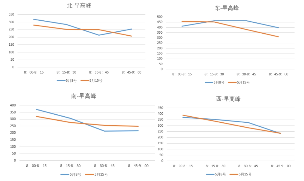 启用溢出控制后,香蜜湖路-侨香路交叉口通行秩序井然,通行能力略微增加,由人工远程控制改为自动溢出控制,在保障交叉口通行秩序的同时,极大的解放了警力资源。下图5月8日为启用溢出控制早晚高峰小时通过量,5月18日为解除溢出控制早晚高峰小时通过量,略微增加5.25%和3.26%。